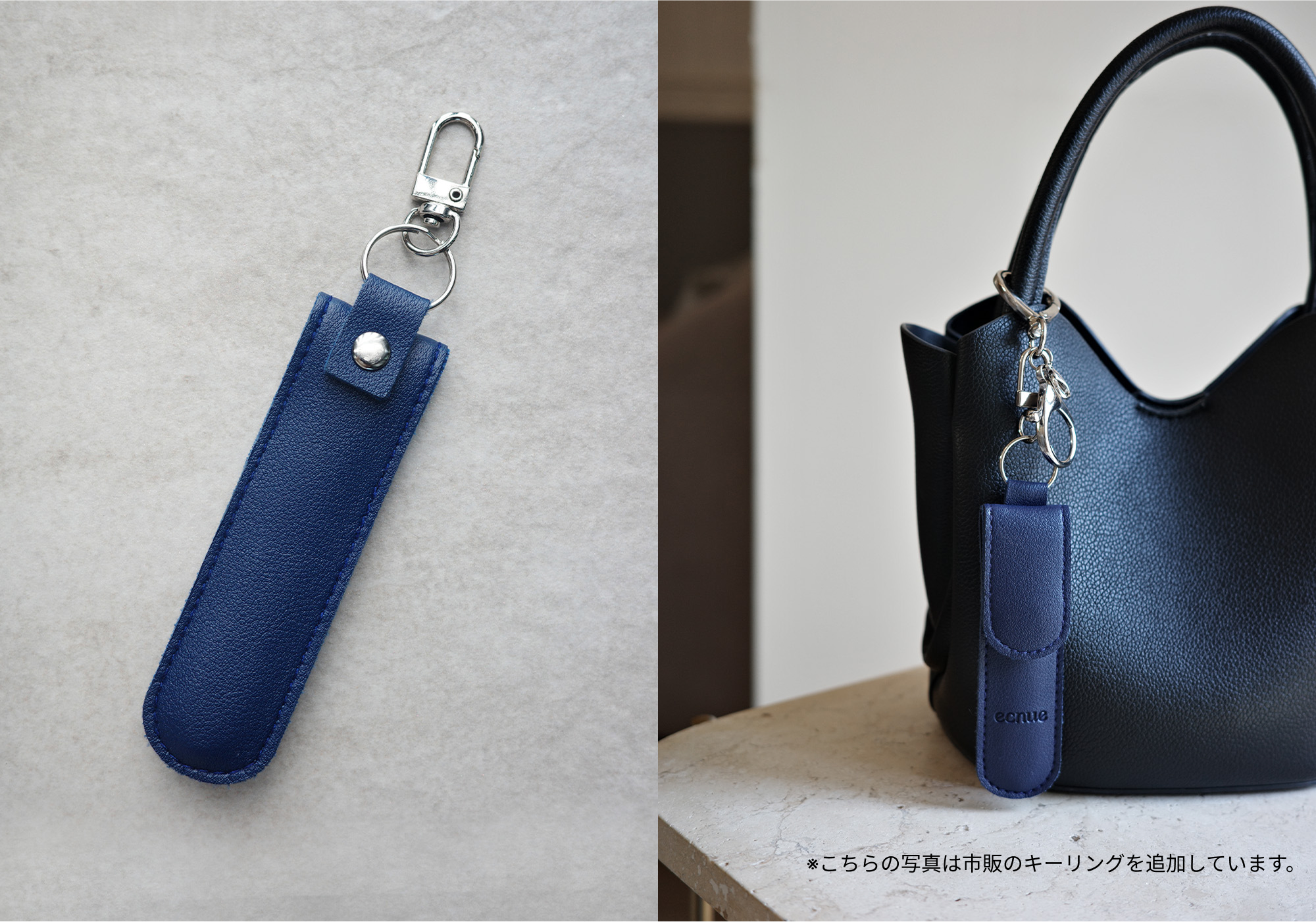 付属のキーチェーンでバッグやポーチに取り付けて